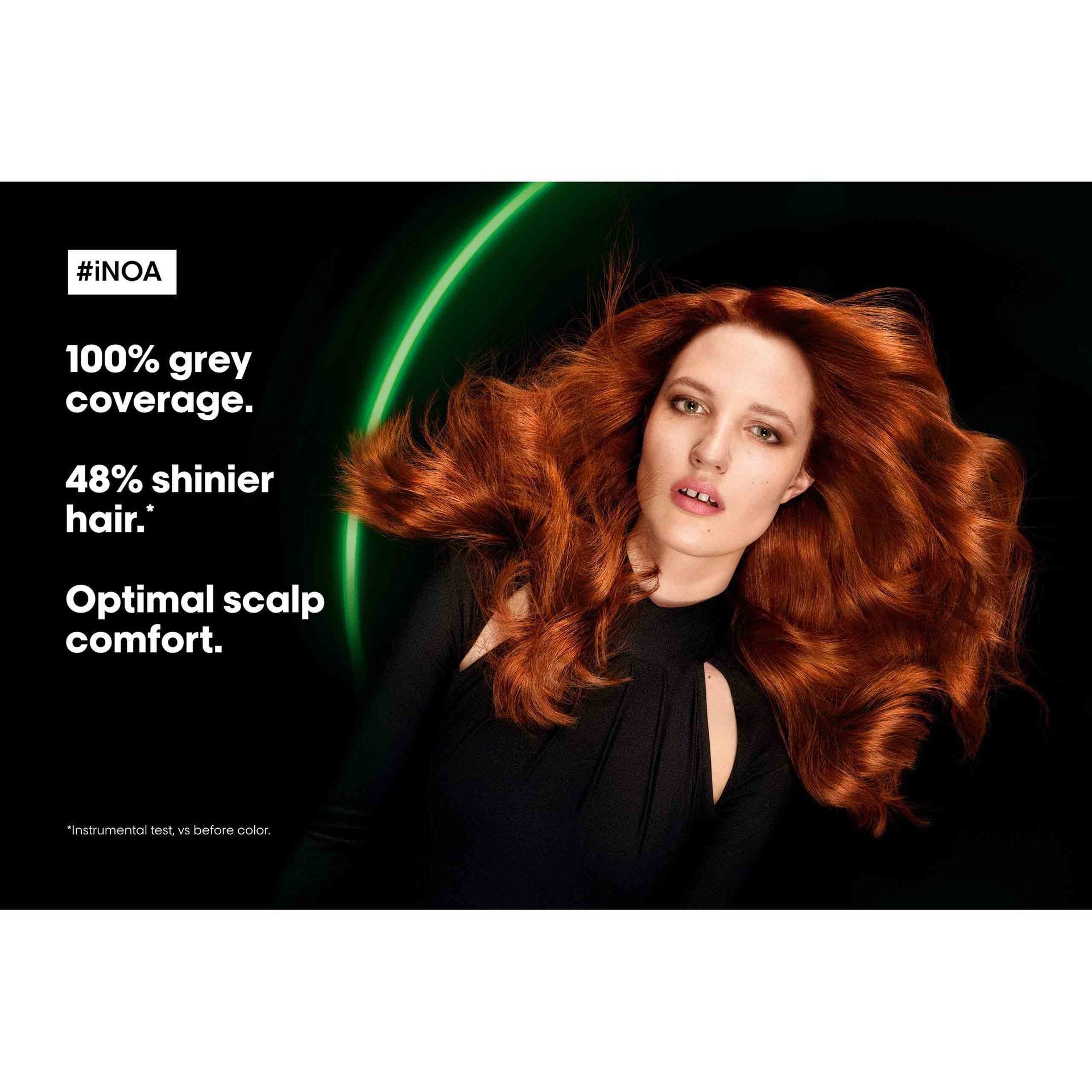 Seeking a permanent and gentle hair coloring solution? Look no further than L'Oréal Professionnel's iNOA color range, a transformative option that beautifies your hair without compromising its health. Free from ammonia, this remarkable iNOA hair color is enriched with 60% oil to prioritise scalp well-being, deliver unparalleled color brilliance, and bestow extraordinary shine that lasts for up to 48% longer*. Another noteworthy advantage of iNOA color is its exceptional ability to cover grey hair completely, by up to 100%^. Say 'yes' to a salon experience that's ammonia-free and embrace the diverse shades of L'Oréal Professionnel iNOA to make a lasting impression. Achieve hair that looks and feels healthier, leaving you with a renewed sense of confidence and style.