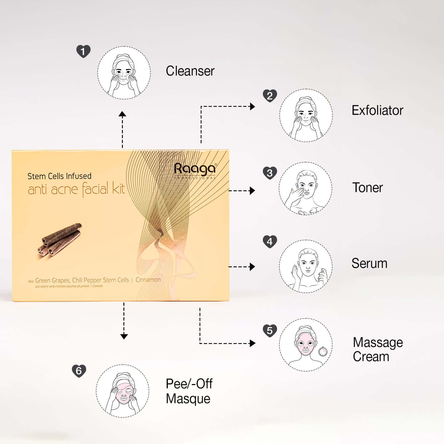 Raaga Professional Stem Cells Infused Anti Acne 6 Step Facial Kit | Cinnamon, Green Grapes, Chilli Pepper Stem Cells | Fights Inflammation (61 gm)